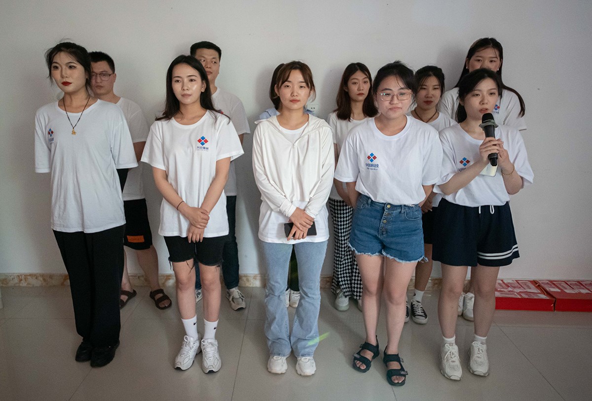 會議第一項:員工士氣展示。各個部門的員工上臺喊出本部門的口號,展現(xiàn)出高昂的士氣,最后由田總評選出最優(yōu)秀的團(tuán)隊。